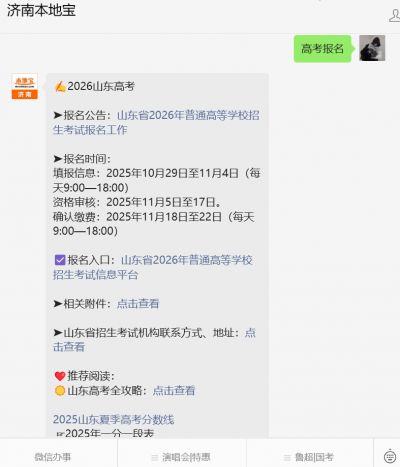 温馨提示:微信搜索公众号【济南本地宝】,关注后在对话框回复【高考】获取2026年山东高考最新消息、报名时间+入口、。报名条件、指南、缴费安排、考试时间、考点安排、准考证打印、成绩查询、联系电话及地址等高考全攻略。(持续更新中)