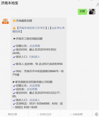 扫描上方二维码,关注【济南本地宝】公众号,在对话框回复【招聘】可获济南/山东最新招聘消息,报名入口和待遇、招聘平台,国企央企事业单位招聘信息等。