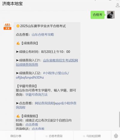 温馨提示:微信搜索公众号【济南本地宝】,关注后在对话框回复【合格考】可获取2025山东夏季合格考成绩查询时间/入口/指南、成绩复核指南、成绩等级划分、各区县咨询电话、学籍号查询、密码/验证码忘记怎么办...等信息(持续更新~~)